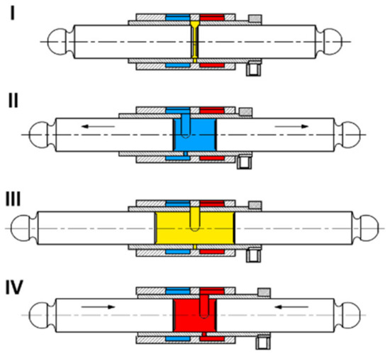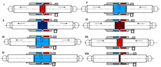 Phase I shows the beginning of the suction process when the fluid is sucked from the high-pressure channel. Phase II presents the switching process when the chamber is cut-off and the pistons are moving apart. In this phase, cavitation may occur. Phase III is the continuation of the suction process when the fluid is sucked from the low-pressure channel. The longer Phase III lasts, in comparison with Phase I, the higher will be the displacement of the pump. Phase IV indicates the moment when the pistons change the direction of their movement. Phase V is the beginning of the pumping process when the pistons are getting closer to each other and the chamber is connected to the low-pressure channel. Phase VI is the moment when high-pressure peaks occur, because the moving pistons still generate a sudden pressure rise in the cut-off chamber. This phase will be the focus of this article and all calculations included in this paper will concern it. Phases VII and VIII show the continuation of the pumping process when the fluid is pumped from the chamber into the high-pressure channel.