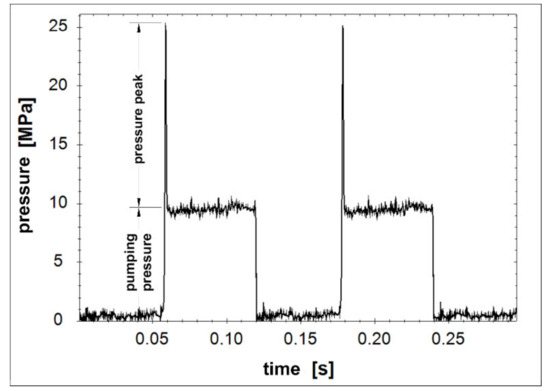 The pressure peak is defined as the difference between the maximal measured pressure inside the chamber and the pumping pressure , which is described by Equation (1) and presented in Figure 5.