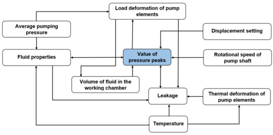 The pressure peaks are influenced by many factors, which change their values directly or indirectly by affecting the other factors. A graph presenting the grid of connections between the factors and pressure peaks phenomenon is shown in Figure 6.