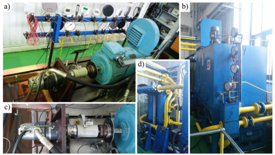 Hydraulic test stand at Gdansk University of Technology [12]: (a) driveline and pressure measurement equipment; (b) tank; (c) pump and mechanical parameter measurement equipment; (d) coolers and heaters.