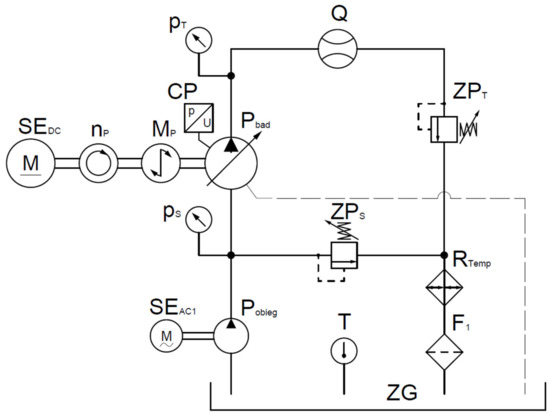 Test stand hydraulic scheme: Pbad—tested pump; Pobieg—preliminary pump; Pwir—auxiliary pump; SE—electric motors; ZP—pressure relief valves; ZG—main tank; RTemp—heat exchanger; F—filters; np—tachometer; Mp—torque meter; p—manometers; CP—internal pressure sensor; T—temperature sensor; Q—flow meter.