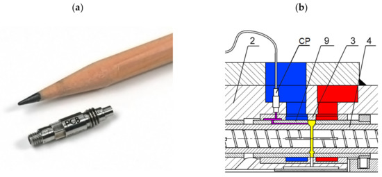 Piezoelectric pressure sensor and its localization inside the pump: 2—body; 3—socket; 4—piston; 9—commutation tube; CP—internal pressure sensor. (a) piezoelectric pressure sensor (b) pressure sensor localization.