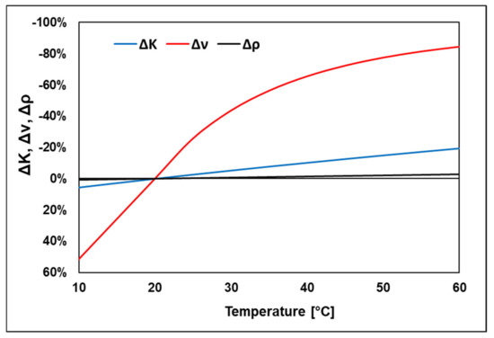 Influence of fluid (mineral oil) temperature on its properties: ΔK-bulk modulus change; Δν-kinematic viscosity change; Δρ-density change (reference values measured at normal conditions).