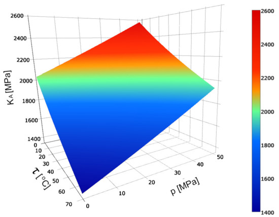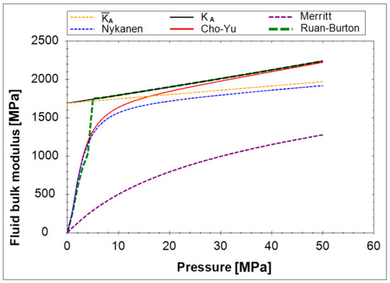 Fluid bulk modulus is extensively featured in the literature [12,18,19] and there are at least several empiric equations defining its value. For the needs of this article, the Equation (4) [19] describing the secant adiabatic bulk modulus was selected: