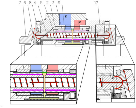 Localization of the leakage sources [12]: red—flow through the hydrostatic supports; purple—flow through the annular gaps between the pistons and commutation tube; green—flow through the gap in the commutation widow; 2—body; 3—socket; 4—piston; 5—spiral choke; 6—slipper; 7—swash-plate; 8—separator plate; 9—commutation tube; 17—guiding tube.