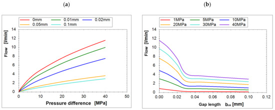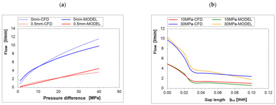 Comparison of the characteristics obtained from the CFD simulation and (21): (a) characteristic of the flow as a function of the pressure difference Δp for different gap lengths bok; (b) characteristic of the flow as a function of the gap length bok for different pressure differences Δp.