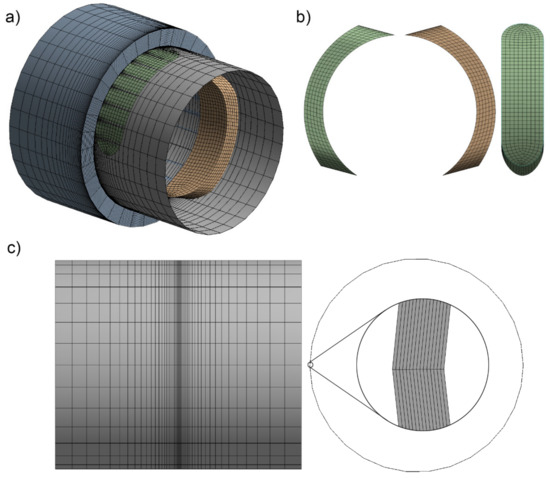 Discretization of the domain into computational mesh: (a) complete model; (b) commutation windows; (c) gap between the commutation tube and socket [26].
