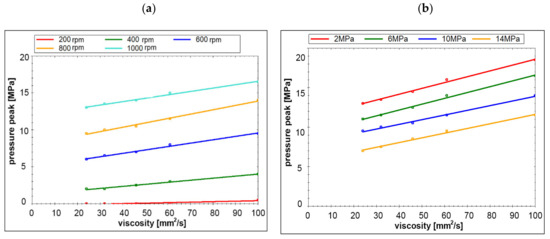 Influence of viscosity on pressure peaks value: (a) measured at a constant pumping pressure of 10 MPa, pump displacement set to 20% of the maximal value and a variable rotational speed; (b) measured at a constant rotational speed, pump displacement set to 20% of the maximal value and a variable pumping pressure.