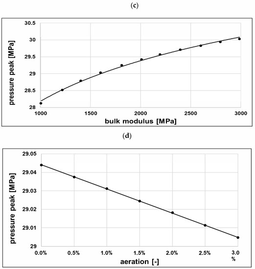 Influence of the properties of hydraulic fluid on the pressure peaks value: (a) influence of viscosity; (b) influence of density; (c) influence of the bulk modulus; (d) influence of aeration. All simulations were conducted with the following settings: pumping pressure p_o = 10 MPa, rotational speed n = 1500 rpm, and displacement setting x = 20%. All constant fluid parameters were properties of the Total Azolla 46 oil, calculated at a temperature of 50°C and at 0% aeration.