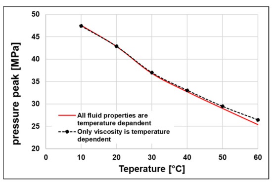 As suggested earlier, the results of the experiment (Figure 25) may not be fully explicit, since during the experiment the change in viscosity was caused by the temperature change. The temperature also affected the bulk modulus and density values (Figure 10). To validate the results of the experiment, a simulation was conducted using models in which all fluid properties were temperature dependent or only viscosity was temperature dependent. The results of this validation are presented in Figure 27. What is easy to notice, is the change in bulk modulus and density caused by the temperature variation did not affect the result significantly. Especially at temperatures below 40 °C, this impact could be described as negligible. Therefore, it is possible to say that the experiment, which was conducted in temperatures varying from 25 °C to 55 °C, presents a true influence of viscosity on the pressure peaks value.