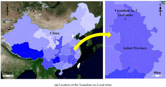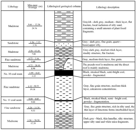 The north auxiliary blind inclined shaft, north transportation blind inclined shaft, and north air return blind inclined shaft compose the primary roadway in the 106 mining area (Figure 1). The trend of the roadway is N47°, and the horizontal spacing between the individual roadways is 35 m. The height of the roadway floor is between −553.3 and −710 m, and the construction level is about 20 m above the 10-coal roof. The 106 dark mining well in the 106 mining area runs from the 10-coal roof sandstone layer to 51-coal, mainly exposing aluminium mudstone, 82-coal, 81-coal, 72-coal, and the interlayer sandstone and mudstone. A comprehensive stratigraphic column of the mining area is shown in Figure 2. The lithology of the fault fracture zone is mixed, mainly mudstone, siltstone, and a small amount of sandstone, with local carbonaceous mudstone or coal. Unit water inflow and permeability coefficient of rock mass were obtained through the pumping test: q = 0.0035 L/s.m, K = 0.0298 m/day, and the results showed that the water richness was weak.