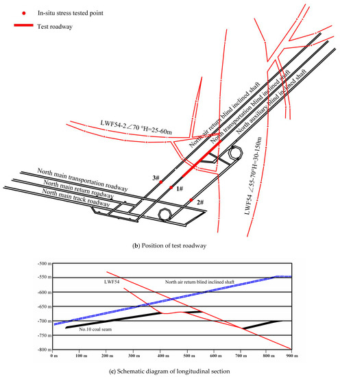 The 106 mining area of the Yuandian no.2 coal mine is located in the north-eastern part of the mine field, with an east–west width of 1900~2700 m, a north–south length of 1800~2500 m, and an area of 4.74 km2. The 106 mining area has a NE-trending uniclinal structure with a NW-dip. The dip angle of the formation varies from 4° to 33° and is generally between 7° and 26°. The two layers containing the coal seam are the 10-coal and 11-coal layers. In the area, 115 faults were detected, all of which were NW-trending normal faults. There are 5 faults with an offset of more than 100 m, 5 faults with an offset of 40~100 m, 32 faults with an offset of 10~40 m, 18 faults with an offset of 5~10 m, and 55 faults with an offset of 0~5 m. LWF54 is the main fault experienced by the test roadway in the manuscript.