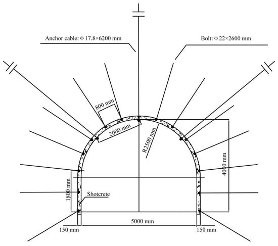 The cross-section of the blind inclined shaft in the 106 mining area is a semi-circular arch with straight walls (Figure 3). The height of the straight wall and semi-circular arch is 1.5 and 2.5 m respectively, whereas the width of the roadway is 5 m. The initial roadway support structure was composed of anchor mesh and cable combined with a shotcrete support. The anchors have a diameter of 22 mm and a length of 2.6 m. The distance between the anchors along the roadway axis and the radial direction are both 0.8 m. The anchor cable has a diameter of 17.8 mm and a length of 6.2 m, and is composed of 8 prestressed steel wires with a diameter of 7 mm. The distance between the anchors along the roadway axis and the radial direction is 2.0 and 2.4 m. The thickness of sprayed concrete (C20) is 100 mm (Figure 3).