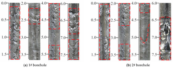 A borehole television imager was used to observe the fractures of the roadway roof in the fault fracture zone. According to the development of fractures, the surrounding rock was divided into completed surrounding rock, fractured surrounding rock, and broken surrounding rock. Two boreholes were arranged in the roof of the roadway, with a diameter of 28 mm and a depth of 8.0 m. The observation results are shown in Figure 7.