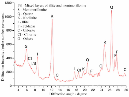 The fault fracture zone contains a mixed lithology composed of mudstone, partially interbedded with carbonaceous mudstone or coal, with significant extrusion and wrinkling. During roadway excavation, the surrounding rock undergoes softening and swelling to water, which further decreases the strength of the surrounding rock. To determine the mineralogical composition of the mudstone, X-ray diffraction analysis was used, and the results are shown in Figure 8. This mineral composition test uses the D8Advance powder crystal X-ray diffractometer produced by the German Bruker Company (Karlsruhe, Germany). In terms of software, the international powder diffraction database (PDF), the powder crystal inorganic crystal structure database (ICSD), and the corresponding analysis software are configured. As shown in Figure 8, the mudstone was composed of a large amount of kaolinite, montmorillonite, and mixed layers of illite and montmorillonite. Among them, kaolinite has water absorption when it is dry, and has plasticity after moisture. The montmorillonite and mixed layer of illite and montmorillonite absorb water and expand rapidly, becoming paste-like. When the rock mass reacts with water physically and chemically, the properties of the rock mass change dramatically, and its volume expands over time, resulting in huge expansion pressure and large deformation. The volume expansion after hydration can exceed 50%.