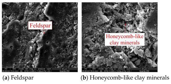 Scanning electron microscopy (SEM) was used to observe the microscopic morphology and composition of the mudstone, as shown in Figure 9. The scanning electron microscopy used the QuantaTM 250 environmental scanning electron microscope produced by FEI Company (Hillsboro, OR, USA) to obtain the micro-morphological features under 2000 times magnification. Results show that intergranular fissures are more developed, and the rock has good water conductance. The expanded pores in the mudstone increase the porosity and the hydrolysis effect of the rock mass. The three-dimensional grid-like holes and the random accumulation between the particles reflect the good permeability of the mudstone and the development of the space channel. Whether it is kaolinite or montmorillonite, uneven expansion occurs after exposure to water, resulting in a large amount of pores. The appearance of these pores destroys the original internal structural system of the rock, which in turn promotes softening and disintegration.