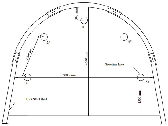 Figure 11. Schematic diagram of advanced grouting construction. - U-shaped steel sheds support parameters: The U-shaped steel model used in this study is U29. As shown in Figure 10, the distance between U-shaped steel sheds along the roadway is 0.8 m. The overlap length of any two U-shaped steels is 0.5 m. The size of the steel back plate is 800 × 1200 × 80 mm.