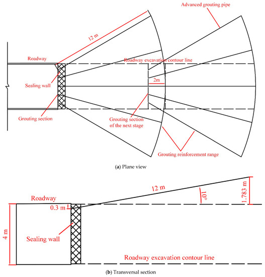 - Pre-reinforced support: Field test results showed that the roof collapses with the roadway excavation due to the poor self-stabilizing capacity. Therefore, advanced grouting is used to support the uncovered roof. Advanced grouting is carried out on the broken surrounding rock in front of the excavation face so that the broken roof in the grouting section is cemented, preventing the surrounding rock from collapsing after excavation. Grouting also ensures the integrity of the roof after excavation, providing the supporting points for the subsequent grouting bolts and grouting cable anchors.