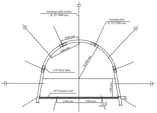 Figure 12. Roadway full-section support diagram. - Grouting cable anchors’ parameters: Grouting cable anchors’ support is shown in Figure 12. As shown in Figure 12, there are five grouting cable anchors in the roadway cross-section, including three grouting cable anchors in the roof and two grouting bolts in the ribs. The grouting cable anchors have a diameter of 35 mm and a length of 7.0 m. The distance between the grouting cable anchors in the roof and ribs along the roadway axis and the radial direction is 2.0 and 1.6 m, respectively. The anchorage length of each grouting cable anchor must be larger than 1.0 m. The secondary concrete support is applied as soon as the grouting cable anchors pavement is finished.