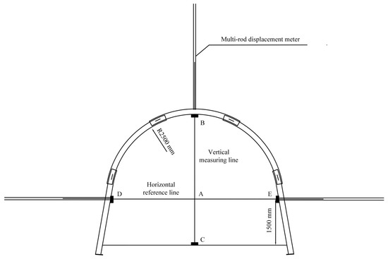As shown in Figure 13, points B and C are the vertical data marks of the roof and floor of the roadway, and points D and E are the horizontal data marks of the two ribs of the roadway. Point A is the midpoint of BC and DE. The decrease of BC means the deformation of the roof and floor. The decrease of DE means the contraction of the two ribs. Measurements by a convergence meter are required to be accurate to 0.2 mm.