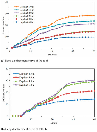 Figure 14 show the displacement curves of the deep surrounding rock in the monitored section. Figure 14a shows that the relative displacement within 6 m of the surrounding rock of the roadway roof is less than 30 mm during the observation period, and Figure 14b,c show that the relative displacement within 6 m of the surrounding rock of the roadway gang is less than 40 mm. After 40 days, displacement of the roadway surrounding rock began to converge, indicating that the overall strength of the roadway surrounding rock after grouting was improved, and the roadway surrounding rock was effectively controlled. The support method can effectively maintain roadway stability.