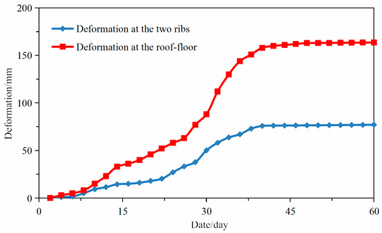The deformation from the two ribs at the monitored section is 75 mm, and the deformation from the roof–floor is 161 mm. After 40 days of roadway construction, roadway deformation began to converge. Roadway deformation after support is obviously reduced, and deformation speed is effectively controlled, making the roadway much safer overall. During the monitoring period, there is no obvious deformation of the surrounding rock of the roadway after adopting the new support design, indicating that the new support design can control the deformation and ensure the long-term stability of the roadway. The effectiveness of the new support design can be visually observed in Figure 16.