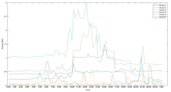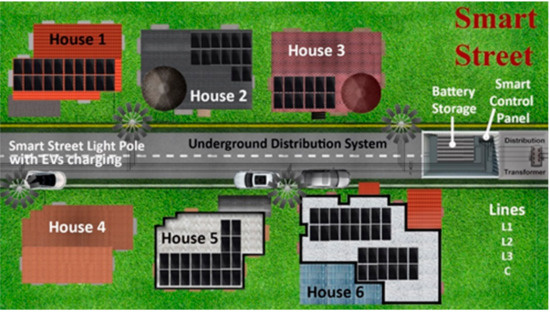 As illustrated in Figure 1, we consider six smart homes, with five having street generation capacity and one having no street generation capacity. Each house has different electricity generation and consumption, and a different battery storage. The street strictly follows the underground distribution system concept. Starting with the transformer, as in the normal street, the distribution transformer is located at end of the street. This transformer has several extra features compared to a normal transformer, such as the ability to measure the voltage, current, active-reactive power, power factor, and harmonics, to self-monitor the life cycle, oil level (oil-cooled transformer), and the temperature of oil, etc. The transformer is protected with two-sided fuse protection, along with other types of protection, such as undervoltage, overvoltage, undercurrent, and over-current protection. Each transformer will have a unique identification number so it can be easily trackable by the utility in case of any fault. The transformer will also share data with the utility after every 15 min. One side of the transformer is connected to the utility grid and another side is connected to the smart control panel of the street.