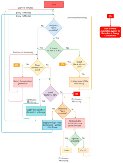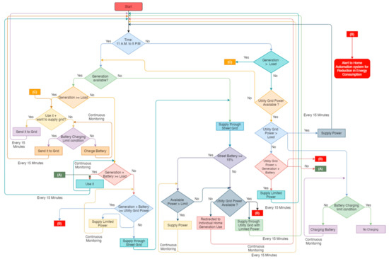 This is the electrical energy flow algorithm to the particular houses in the street with multiple energy sources. Potential sources of energy supply to the homes are home street generation, home battery storage, home street generation + home battery storage, street battery storage and the utility grid supply. The condition for street battery charging is also covered in this algorithm. Along with this, a home automation alert system is integrated for cases where there is a heavy consumption of energy in peak demand times or less availability of energy generally. On Figure 3 is shown electrical energy flow algorithm for household.