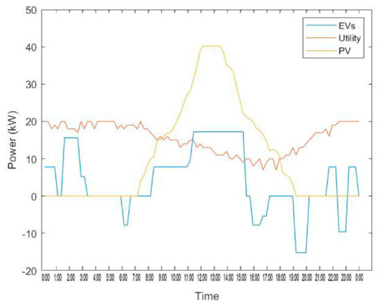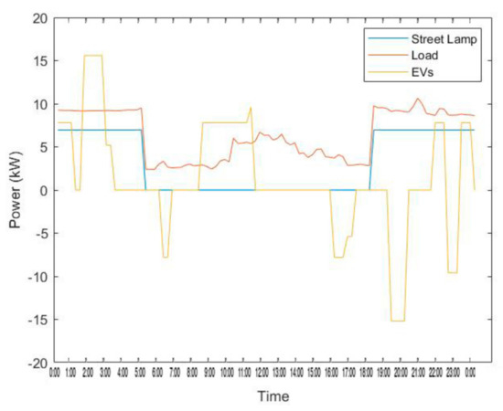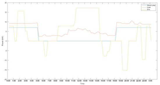 - As mentioned in the conditions, the utility grid power went down for 6.5 h during the daytime. Electricity supply was fulfilled by the street generation, street storage, and EVs. For extreme conditions, the day was considered a partially cloudy day. Thus, PV street generation was lower too.