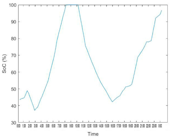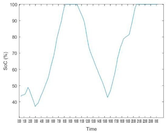 Figure 23. State of charge of Street Battery in CSPVPD. - In a normal working day, PV adequately fulfils the peak hours load and charges the street storage battery too. Almost 36.26 kWh of charging is done during this time.