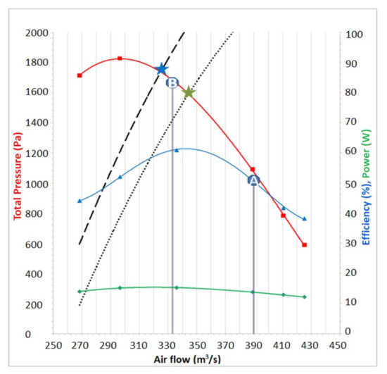 As it can be seen in the diagram, the pressure demand of the network increases with appearance of leaks, while the volume of flowing air decreases. The point of co-operation of the duct with the fan, which is marked with a green star, shifted to the left side of the characteristic to a new point (blue star), exceeding the lower limit of the recommended fan operation point (point B) and leading to the stall operation of the device.