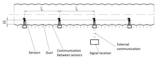The developed leak detection system is based on a measuring cascade (Figure 3) consisting of pressure sensors (measuring static pressure, total pressure, and the resulting dynamic pressure in relation to the barometric pressure in the working) communicating wirelessly with each other. The distance between sensors (L) should be selected optimally, taking into account several factors, such as the resolution of measuring sections (leak location accuracy), the cost of implementing the monitoring system, and the wireless communication range.