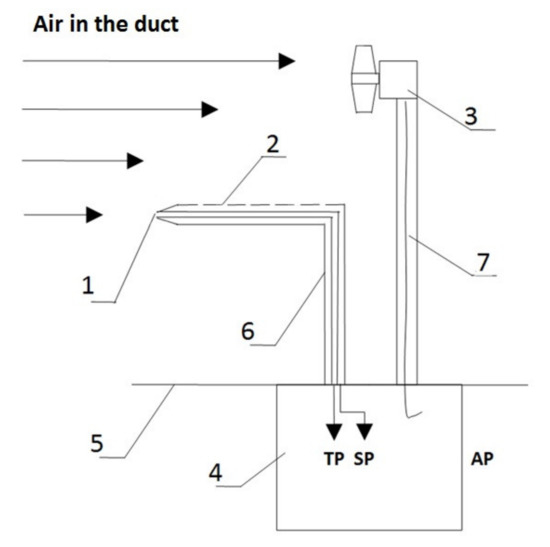 Simplified diagram of the measuring module: 1—inner channel of the Prandtl tube, 2—the opening of the outer Prandtl tube, 3—turbine with a power generator, 4—measuring transducer with a trans receiver module, 5—cable wall, 6—Prandtl measuring tube, 7—electric wire, TP—total pressure, SP—static pressure, AP—atmospheric pressure.