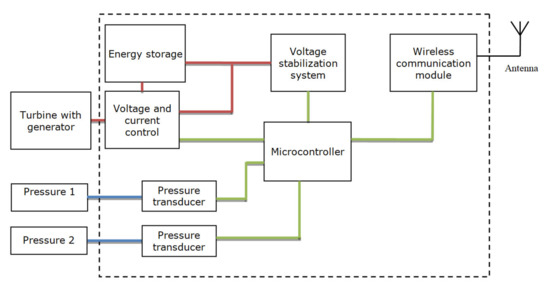 The internal structure of the measuring system is presented in Figure 5. The sensors are powered by the electricity generator (Figure 4, point 3), which converts a part of the mechanical energy of the flux flowing in the duct into electricity, and by an energy storage component, which can supply power when a turbine of the generator fails. Electricity parameters are monitored by a microcontroller using the voltage and current converters. Pressure in the accumulating tubes is measured by two pressure transducers, from which the information is sent to the microcontroller, and then via the wireless communication module to the other sensors and the external system of visualization and archiving the measurement data. The prototype of the device is shown in Figure 6.