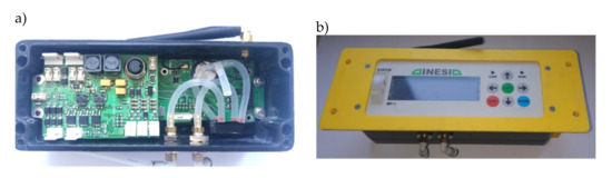 The electronic circuits were designed in compliance with the intrinsically safe principles [34,35]. Due to the limitations related to this, the battery charging circuit of the measuring device uses a charger in the form of an integrated circuit, which enables the Li-Ion battery to be charged with a current of up to 400 mA and at 4.2 V. The measuring device uses batteries Li-Ion with a capacity of 3450 mAh. In normal, continuous operation (without alarm states), the measuring module draws the current of 315–420 mA (depending on the battery charge (3.3–4.2 V). At these parameters, the battery can work for up to 11 h. The use of a turbine enables continuous recharging of the battery.