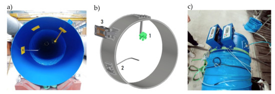 Measuring device installed in the connector: (a) view of the test model, (b) 3D model view (1—supplying module, 2—Prandtl probe, 3—measuring module), (c) view of measuring devices.