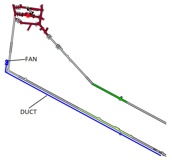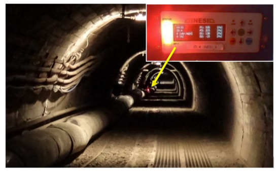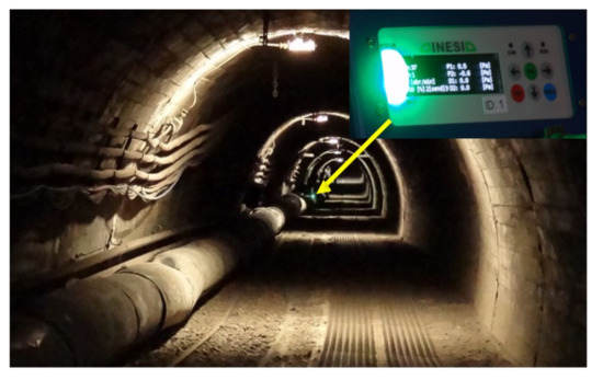 The underground lignite mine (Valenje Pregomovnik—Slovenia) was the last place of tests. Figure 9 shows a fragment of the mining map covering the test stand. The tests were designed to verify the operation correctness of the air leak detection system in real conditions. On the section of about 500 m of the duct D = 600 mm (marked in blue in the figure), six connectors were installed, four of which were intended for the installation of measuring devices and two were blinded ones enabling a leakage simulation by opening the inspection windows.