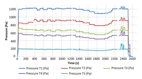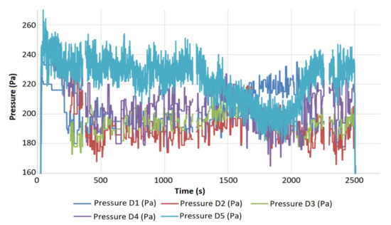 Figure 10 presents the waveforms of static pressure from five measuring devices, which were recorded during the tests carried out in industrial conditions. The diagram shows two test series that were carried out in one fan operation cycle. Program I started after approximately 400 s of testing. Successive points between the measuring modules were unsealed and then sealed. The measurement according to program I was completed within about 1200 s of the test. The next measurement (according to program II) was taken from 1300 to 2200 s of the test. During the tests, the sequence of unsealing was changed, starting the process from the point between the 4th and 5th measuring device. Sealing also took place from the end point toward the beginning of the duct.