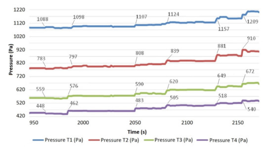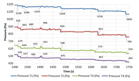 The second part of the tests consisted in unsealing all the sections one by one, so that at a critical moment, all the sections were unsealed and then sealed. Unsealing of the system was started between points T4 and T5 and before progressing to between T3 and T4. It was unsealed at two points with an interval of several seconds; then, in 1405 s, the glands between points T3 and T4 were sealed, which after a few seconds were unsealed again. In the next steps, the ducts between the points T3 and T2 and T2 and T1 were unsealed. Figure 12 and Figure 13 shows the pressure distribution along the duct with successive unsealing and sealing. The numbers above the graphs are the pressure values at which significant changes occurred, which was the basis for identifying possible leaks.