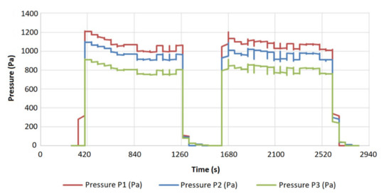 The pressure recorded by the sensor No. 2, which was installed about 40 m after the first sensor, is shown in blue. The last sensor, the values of which are marked in green, was placed 80 m behind the second sensor. The graphs clearly show the pressure drop, with an increase in the distance from the fan caused by the unit aerodynamic resistance (quality of the material smoothing surface) and the mass transfer coefficient (duct leak tightness).