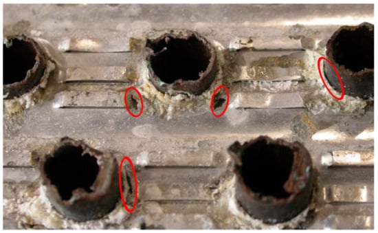 Gaps in the fin on the circumference of the tube created by a corrosion process, marked areas in the Figure (photo provided by courtesy of Blygold company [7]).