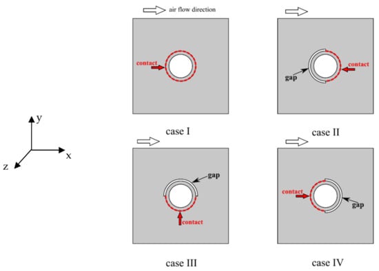 Different positions of the gap with respect to airflow: Case I—without gap; Case II—the gap in the front of the tube; Case III—the gap in the top position; Case IV—gap in the back of the tube.