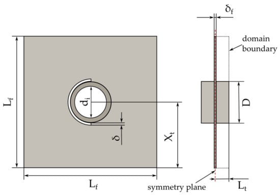 The computational domain is a repeatable slice of the heat exchanger geometry, which is shown in Figure 3. The length and width of the domain are equal to the distance between axes of the tubes Lf. The thickness of the fin in the computational domain is half of the actual fin thickness δf, as the temperature field is symmetric at the opposite half of the fin (see the symmetry plane in Figure 3). Tube length in the domain equals ½ of the distance between fins. Taking the half of inter-fin spacing is a consequence of the flow symmetry assumption. The actual domain boundary is marked in Figure 3 by a dashed line and spans up to the symmetry plane. The specific dimensions of the domain are given in Table 1.
