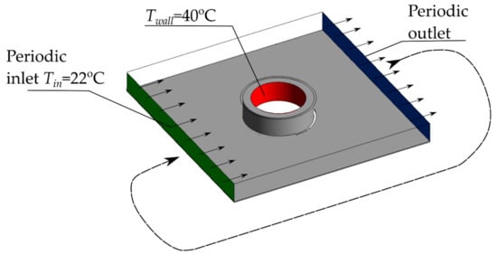 The above-mentioned conditions for the periodicity of the airflow are practically implemented in the Ansys-CFX CFD software. The boundaries named in Figure 4 as periodic inlet and periodic outlet are coupled as two flow interfaces; the target mass flow can be specified, which is obtained by iteratively changing the pressure gradient β. Negative heat flux has to be fixed at the periodic outlet boundary to balance the heat transfer rate gained by air flowing through the domain, as the outflowing fluid is “returned” to the inlet (Figure 4). If a heat sink is not introduced, the air temperature rises infinitely during the solution process of the numerical simulation, causing the solver to crash after reaching some maximum temperature level. In the case of numerical simulations carried out within this research, the domain was properly thermally balanced to keep the inlet temperature at an approximately constant level of 22 °C. The symmetry boundary condition is applied at domain boundaries that were not marked in Figure 4 (for both solid and fluid surfaces).