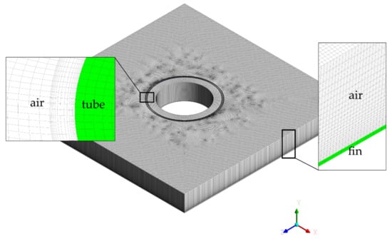 The computational domain is divided into three parts: air (fluid), fin, and tube (solids). It was assumed that the thermal conductivity of the solid (aluminum) is constant in the tested temperature range, which is λ = 202.4 W/m/K. A periodic flow was solved with the following boundary conditions and parameters: