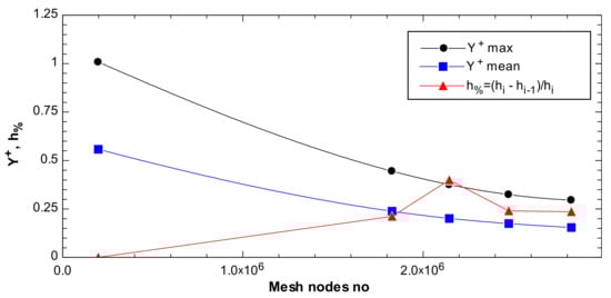 The grid independence study was performed using a methodology similar to used in works [23,24]. The five grids were tested, namely, coarse, average, fine, very fine, and the finest corresponding to mesh sizes: 0.2 × 106, 1.8 × 106, 2.14 × 106, 2.48 × 106, and 2.80 × 106 nodes. For all of the five meshes, the prism layer elements number at the wall was gradually increased, starting from 10 for the coarse grid by 25, 30, 35, up to 40 for the finest one. The Y+ parameter and percent change of mean heat transfer coefficient h% were presented in Figure 6. The h% is the relative difference between the obtained average heat transfer coefficient for the ith mesh refinement level and i − 1 refinement (the one-step coarser mesh). The change does not exceed 0.5%; therefore, the average mesh (1.8×106 nodes) was chosen as optimal because it also satisfies the maximum Y+ < 1 condition (maximum Y+ = 0.44, average Y+ = 0.24).