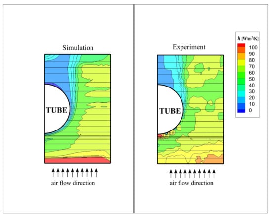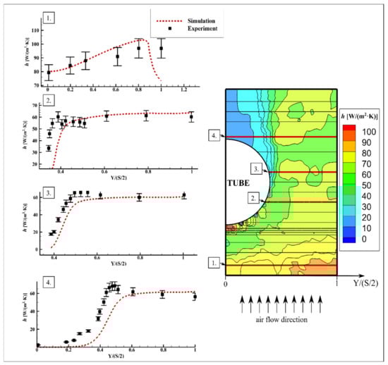 The accordance of the simulation’s local h with the experiment is shown in Figure 8. Four lines were chosen, where the measurements were taken exactly—at the front (line 1), back (line 4), and middle segments (lines 2, 3) of the fin. Most of the experimental data is in very good agreement with the CFD solution (maximally ±20% and better). The greatest discrepancies are noted in the near tube region, but they can be caused by the fact that in the experiment [16] the tube surface was adiabatic. The uncertainty of the experimental h was also plotted in the form of error bars. It was based on the estimation of the uncertainty of Sherwood number measurements done in [29] (uncertainty within 7.3%).