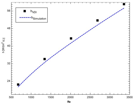 A comparison between simulation heat transfer coefficients and VDI correlation is presented in Figure 9. The two data sets’ values are very close. The relative difference varies from 4.9% for the lowest Re to 1.8% for the biggest airflow.