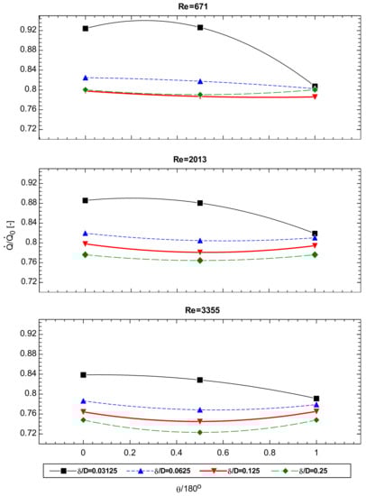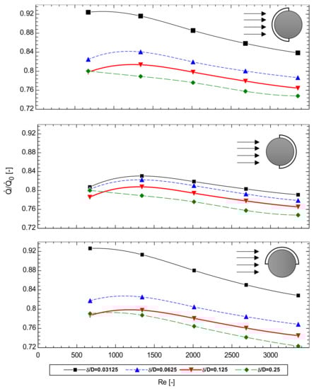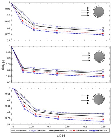 A clearer picture of how the flow velocity influences heat transfer emerges from Figure 11. A decreasing trend of is seen with increasing Reynolds number, excluding the smallest Re departing from this pattern. In the range of Re > 1342, there is a nearly linear negative slope. However, in the span of Re = 671–1342, the decrease of heat transfer rate ratio is smaller or even there is a reverse trend (increase), indicating there can be a change of the flow regime. The curve for the smallest gap is placed remarkably higher than the other ones for the side and front location. Other δ/D cases, for all slit positions, exhibit similar trends, with the δ/D = 0.125 curve approaching or even crossing δ/D = 0.25 with decreasing Re.