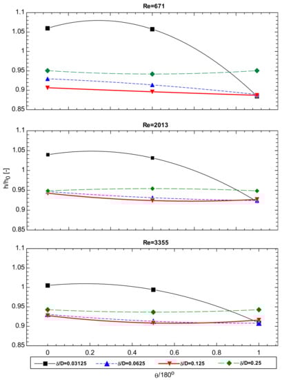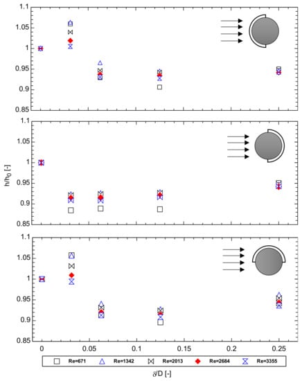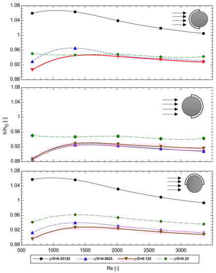 In Figure 14, the h/h0 dependence on the Reynolds number is shown. For the side and front cases at δ/D = 0.03125, the convective heat transfer enhancement is existing at the whole range of Re numbers. For all slit thicknesses, there is a weak decrease of h/h0 with the increase of the flow velocity. The smallest discontinuity heat transfer coefficients diverge from the wider gap cases, being at least 4% higher, whereas for the rest of the example values are adjacent to each other. There is not any enhancement for the rear position; the highest h/h0 are noted for δ/D = 0.25 at a nearly constant value of h/h0 = 0.95 for the whole range of Reynolds numbers, diverging from the rest of the considered cases. At the lowest Re, for the remainder examples, the h/h0 reaches a minimum of approx. 0.88, with a local maximum at Re = 1342, and for the rest of the volumetric flow range there is a decrease with the increase of Re.
